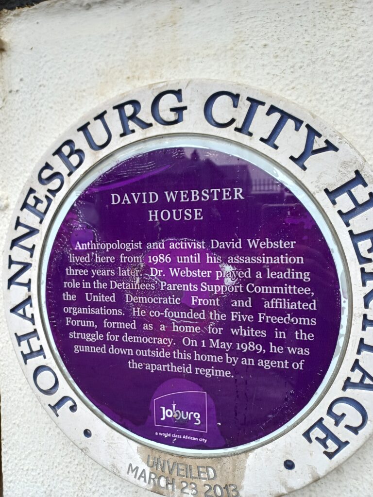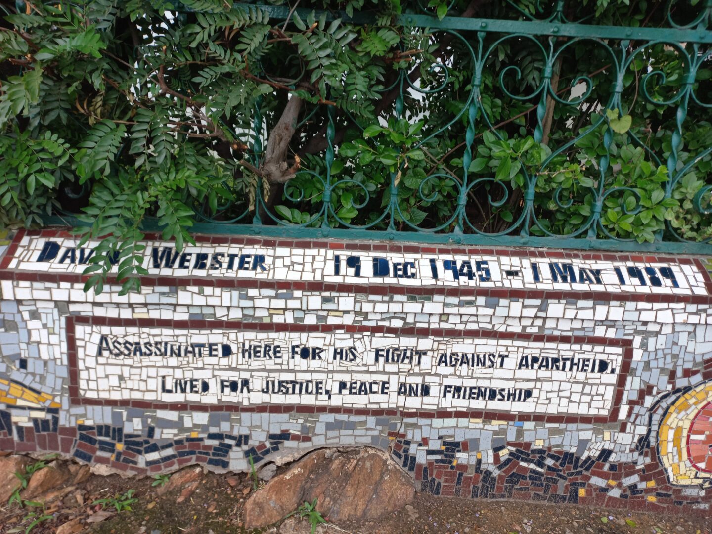 In 1999, ten years after the death of D avid Webster, Maggie Friedman and a group of David’s friends, put up a commemorative mosaic on the garden wall on the street side. The inscription reads: DAVID WEBSTER 19 DEC. 1945 – 1 MAY 1989 ASSASSINATED HERE FOR HIS FIGHT AGAINST APARTHEID LIVED FOR JUSTICE, PEACE AND FRIENDSHIP