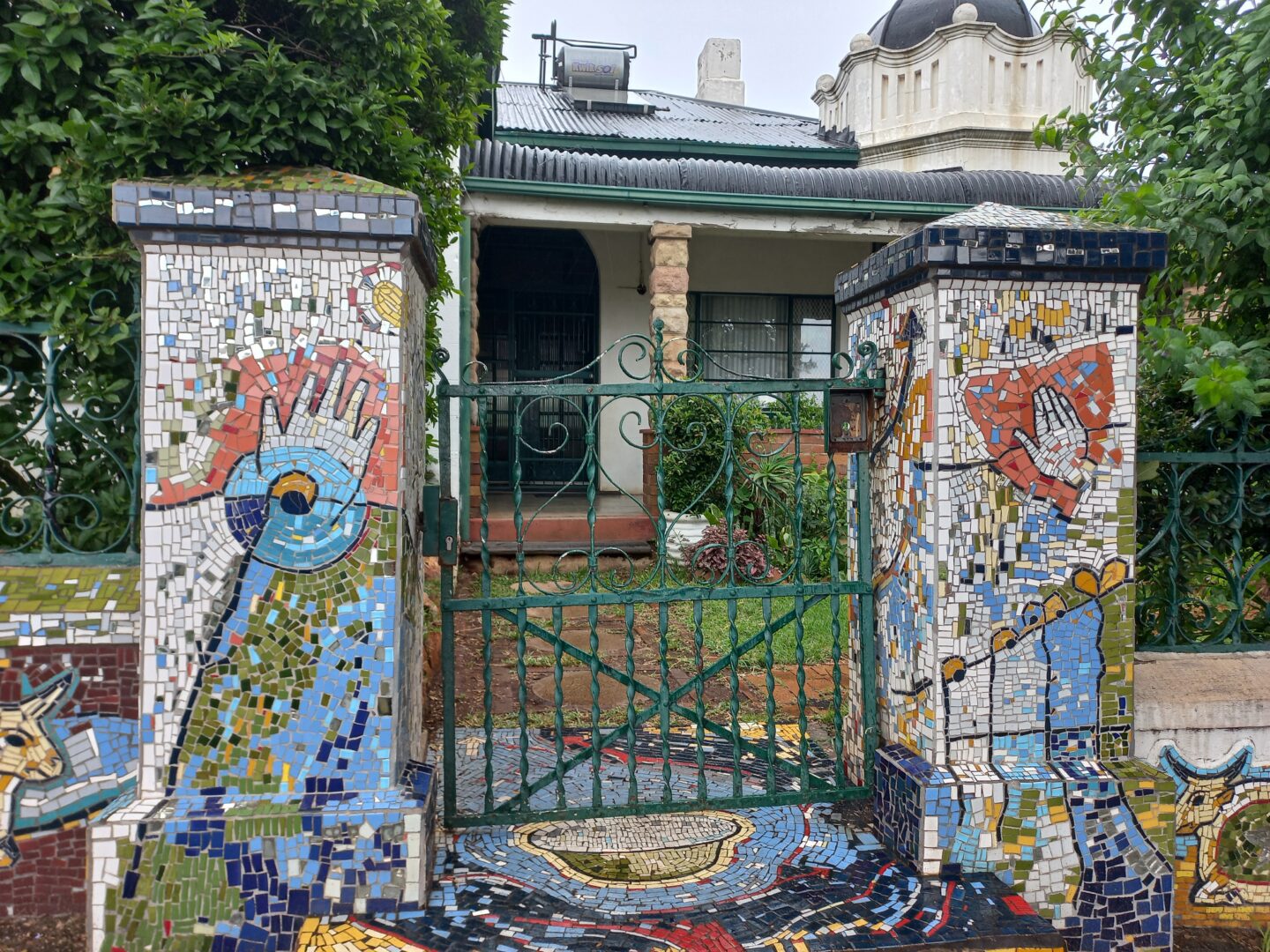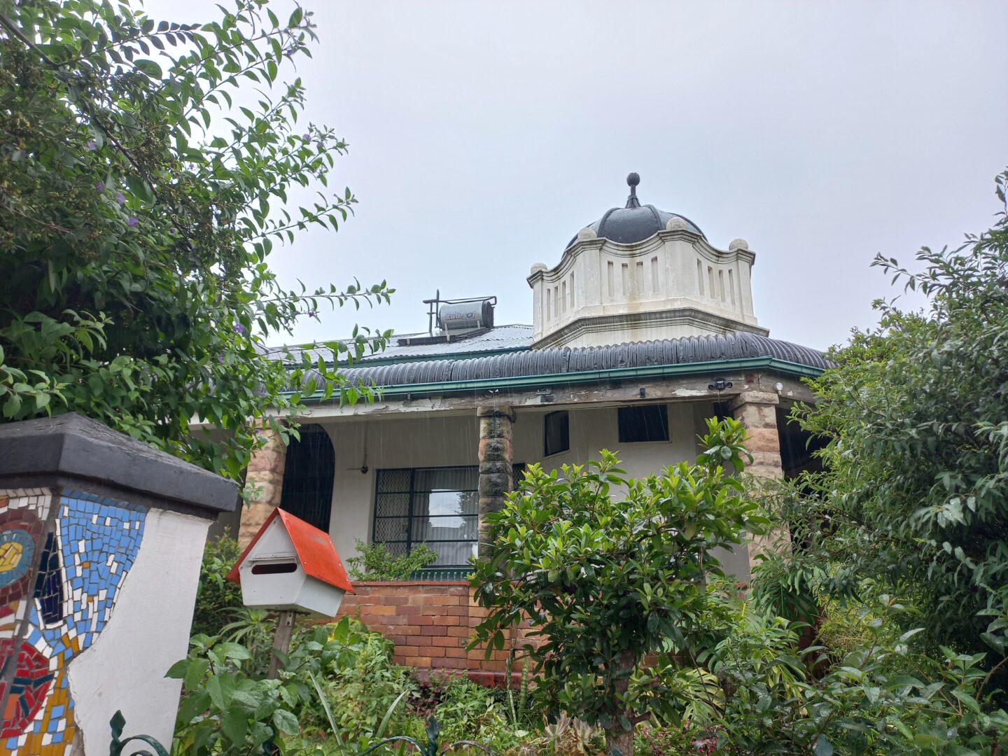 The house has stone foundations with a verandah in the front and along one side with the sitting room opening onto the verandah. In one corner is a turret with a hexagonal base, which was opened up internally in about 2000. Within the turret is a bathroom with extraordinary mosaic tiling.
