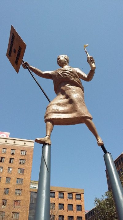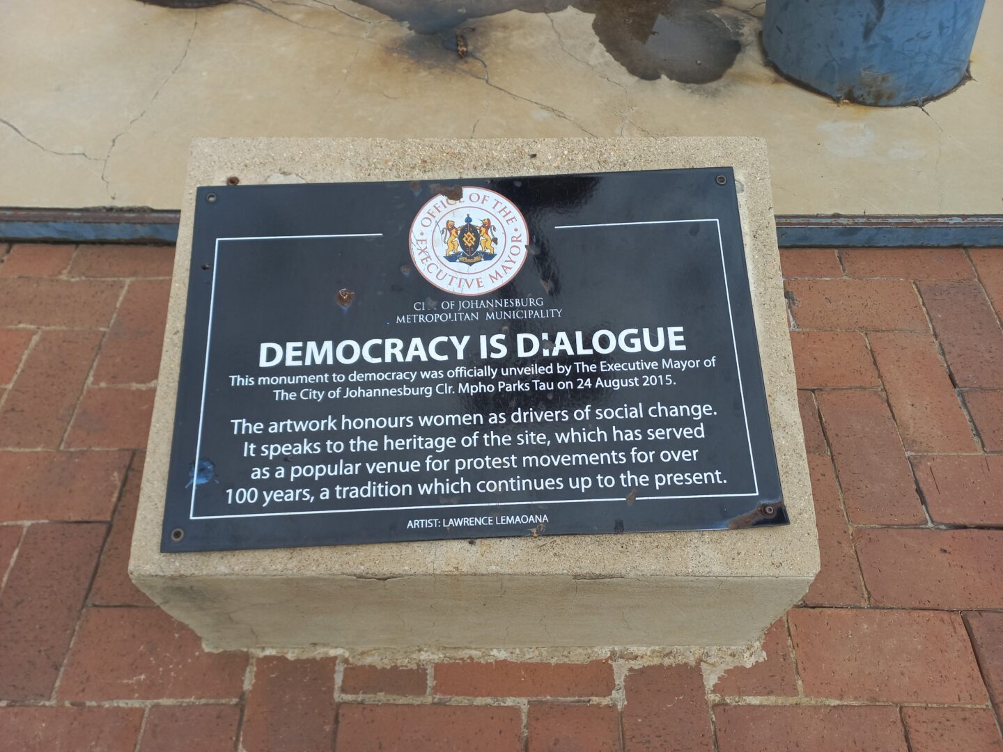 DEMOCRACY IS DIALOGUE This monument to democracy was officially unveiled by The Executive Mayor of The City of Johannesburg Clr. Mpho Parks Tau on 24 August 2015. The artwork honours women as drivers of social change. It speaks to the heritage of the site, which has served as a popular venue for protest movements for over 100 years, a tradition which continues up to the present. ARTIST: LAWRENCE LEMAOANA