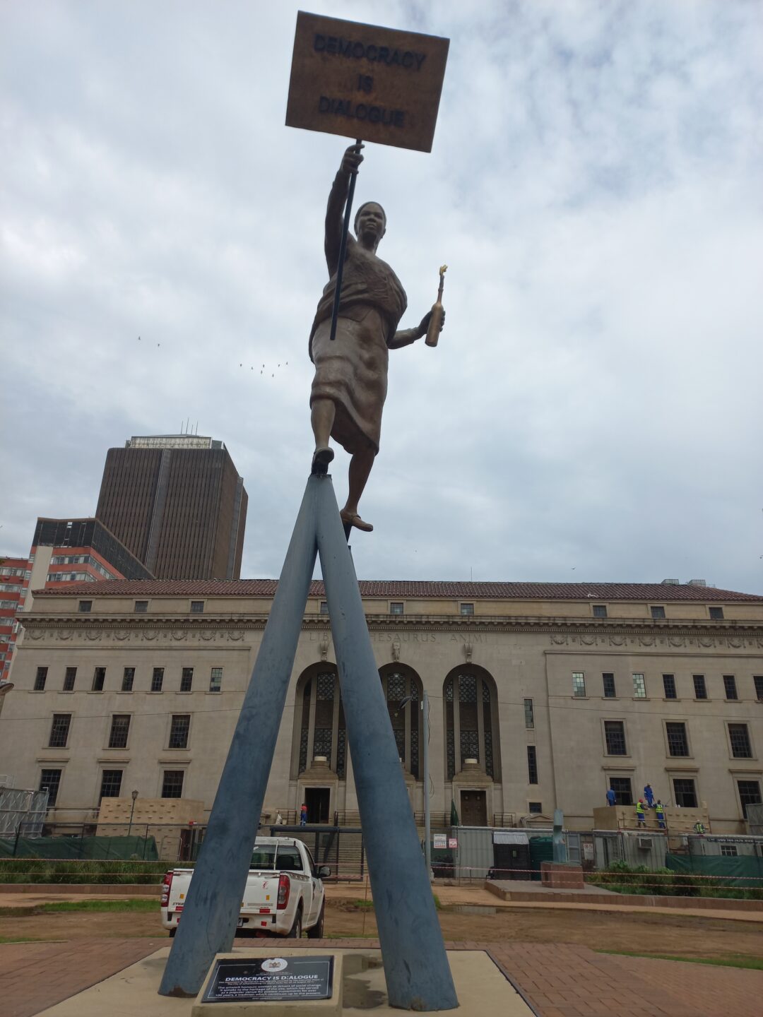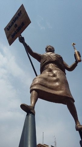 The monumental bronze sculpture depicts a black woman demonstrator carrying a baby on her back. A placard held up by the figure carries the slogan “Democracy is Dialogue”. In her other hand, she holds a candle in a bottle.