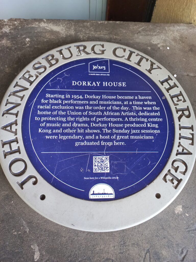 A blue heritage plaque was installed at the entrance to Dorkay House by the City of Johannesburg in November 2017. The inscription reads: DORKAY HOUSE Starting in 1954, Dorkay house became a haven for black performers and musicians, at a time when racial exclusion was the order of the day. This was the home of the Union of South African Artists, dedicated to protecting the rights of performers. A thriving centre of music and drama, Dorkay House produced King Kong and other hit shows. The Sunday jazz sessions were legendary, and a host of great musicians graduated from here.
