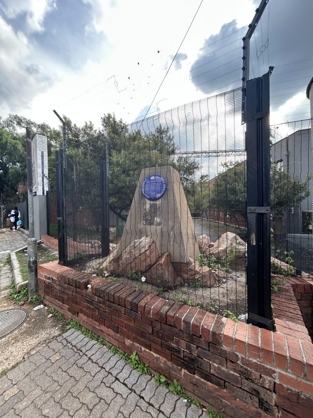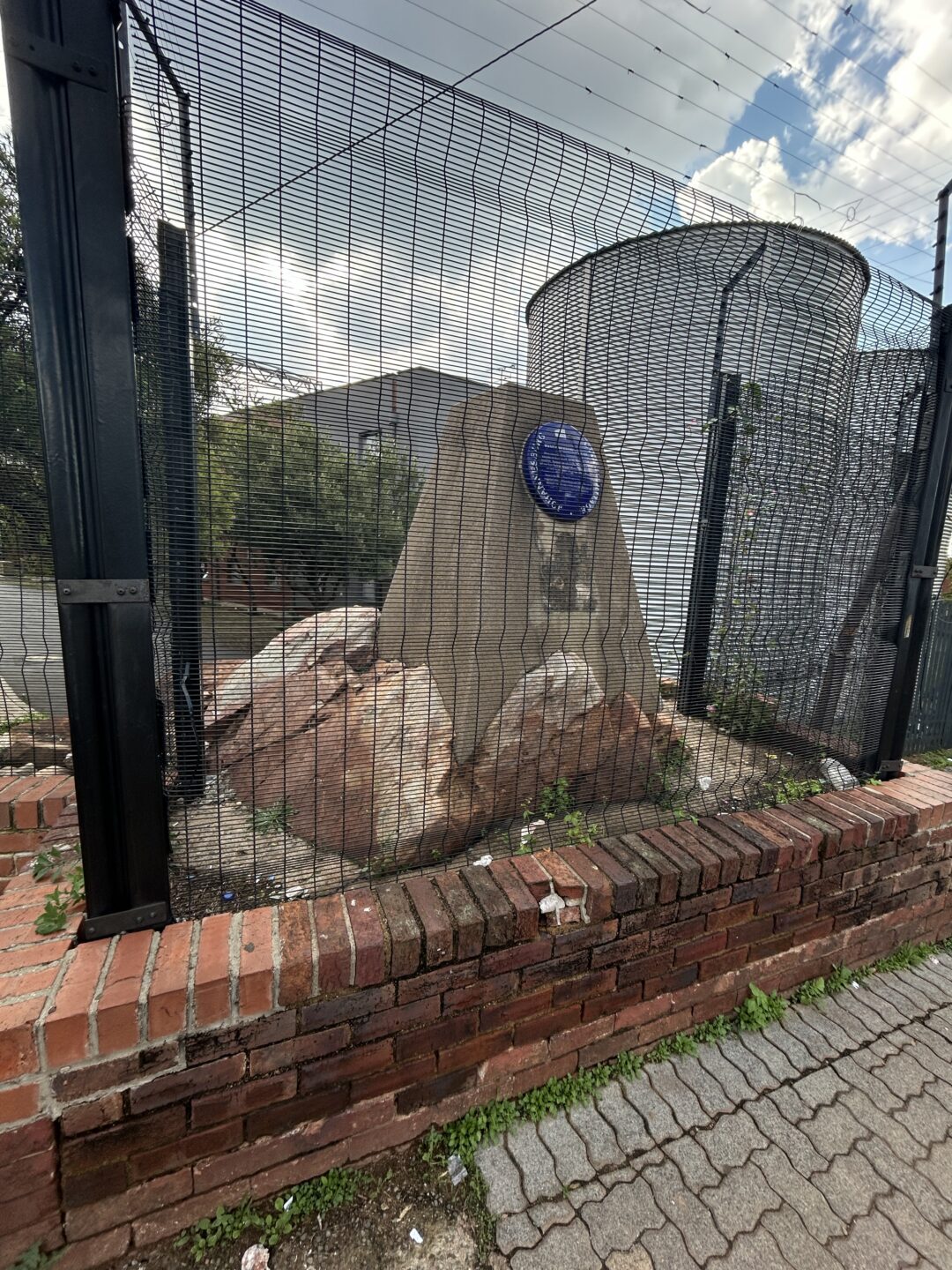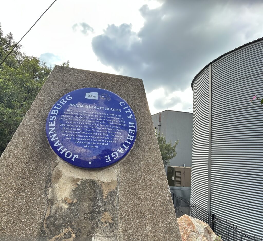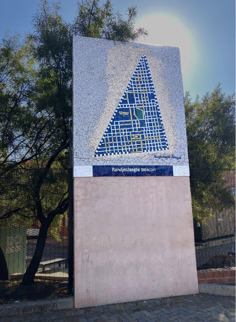 The beacon marked the northern corner or apex of the farm. Today the southern points of the Randjeslaaagte Triangle are in Commissioner Street, at the corners of Ntemi Piliso in the west and End Street in the East. The original beacons on these corners long gone missing by 1946, when the City Council erected two pedestals to mark the southern points of the triangle. The End Street position is marked by a mosaic on the nearby bridge support.