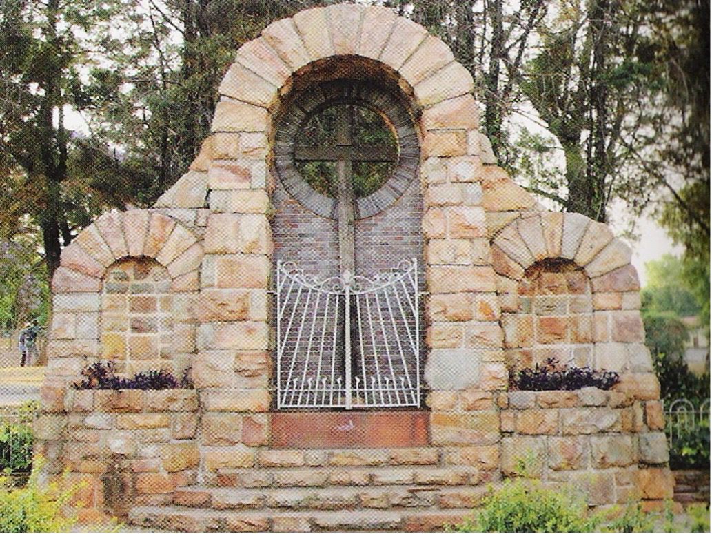 Symmetrical triple arched memorial constructed in fine hammer-dressed quartzite, the central, taller arch flanked by two smaller arches.  The central semi-circular arch has an infill panel of blue face-brick pierced with a circular opening which provides a visual frame for the timber cross which in turn is protected at its base by a fine wrought iron screen. This screen is no longer in place.  Broad hammer-dressed quartzite steps provide an elevated approach to the cross.