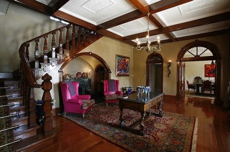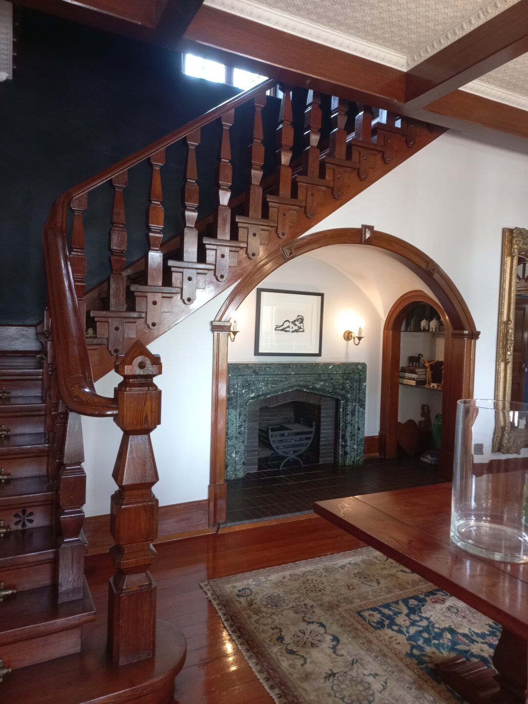 A large hall with a solid timber staircase and arched inglenook under the stairs was entered from the veranda. The hall provided direct access to a billiard room (to the east) and the dining room with facetted bay window to the east on the north side, as well as into a passage leading to a small porch and guest cloakroom, and to the kitchen with attached scullery and pantry and a small west facing bedroom.