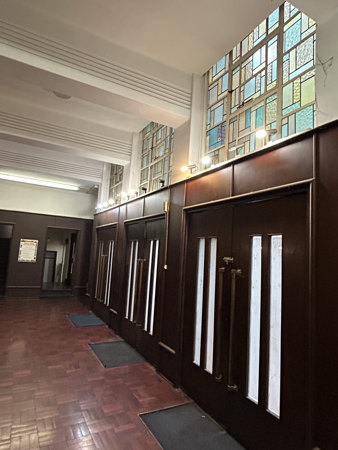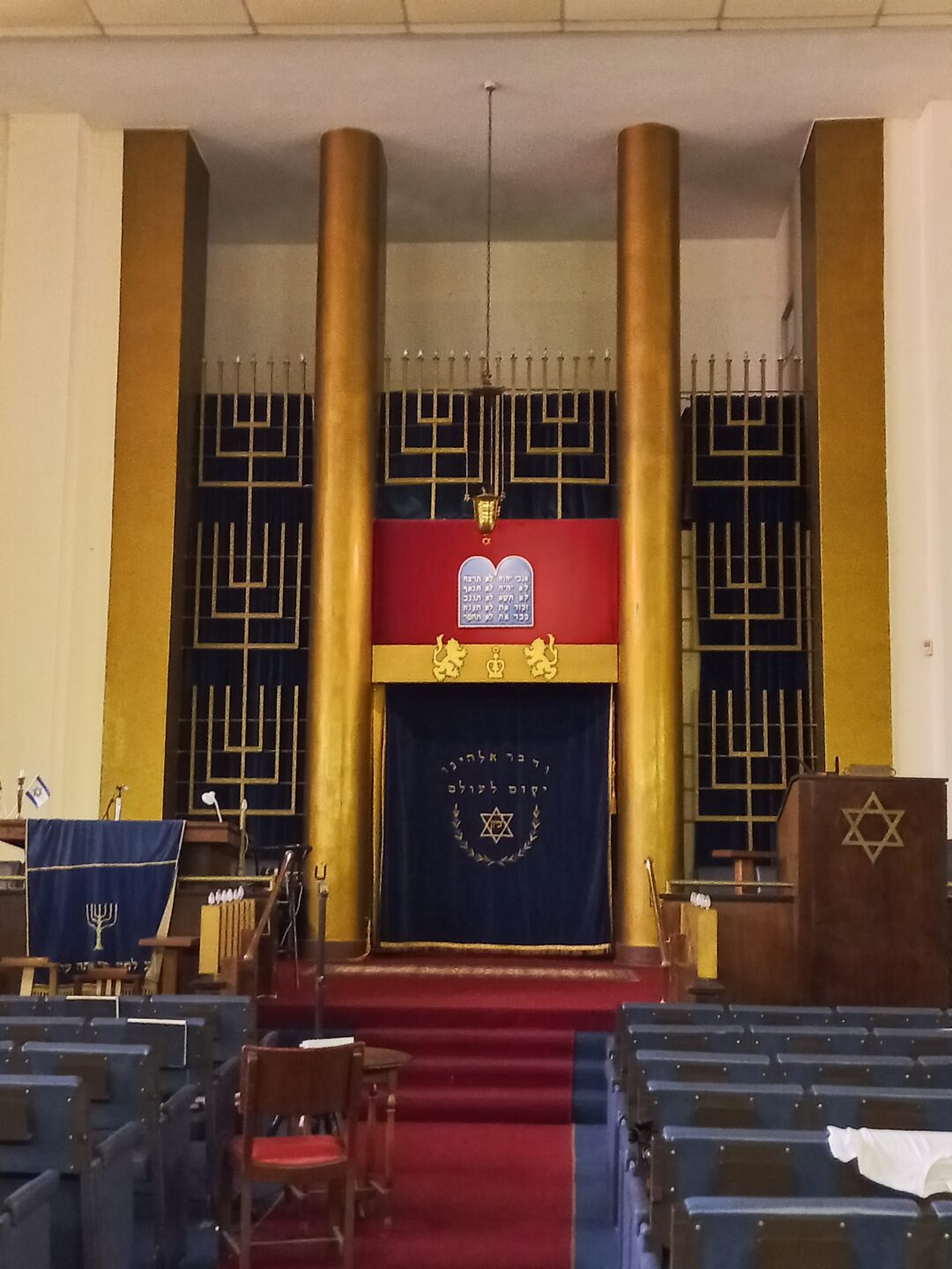 The synagogue is designed in the Art Deco style which was popular in the 1930s. The temple area follows reform tradition by having an elevated or raised bimah with a choir loft above and behind the ark. It has a gallery – but unlike traditional synagogues the gallery was not in order to separate women from men but to provide additional accommodation.