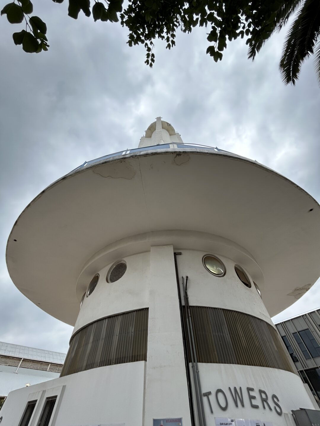 A raised circular cantilevered viewing platform was originally provided at the base of the tower. The curved outer edge of this platform was slightly recessed behind the faces of the four fins and was protected with a wrought iron deco-style balustrade. Circulation around the viewing platform was made possible with door ways let through each of the fins at their junction with the curved face of the tower. Access to the viewing platform was via an attached, curved open stair on the west side of the tower, set between two of the fins.